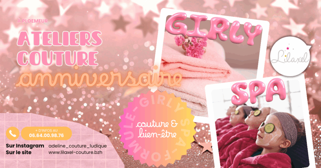 Nouveau ! Anniversaire couture & Spa : Formule clé en main, avec le goûter inclus (gourmandises sucrées et bar et bonbon). Côté couture, les enfants confectionnent un bandeau spa pour les cheveux, puis profitent d’un moment détente en faisant un masque à l’argile. ⇒ Les mercredis, samedis, dimanches- Sur réservation –Plus d’infos sur les formule anniversaires de Lilaxel ICI