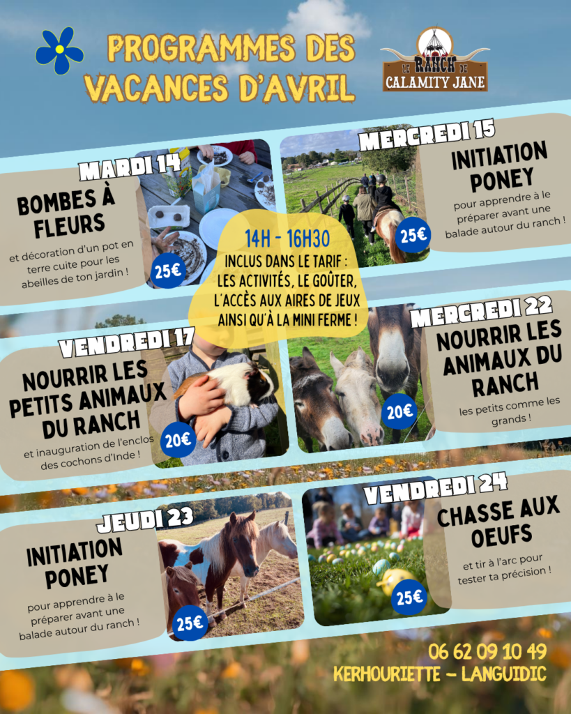 Offrez à vos enfants une sortie à la fois ludique et dépaysante ! Pendant les vacances de printemps, le Ranch de Calamity Jane vous accueille pour des après-midis ludiques dans leur ranch ! Activités auprès des animaux, chasse aux oeufs, ateliers créatifs, soins aux poneys, etc… les enfants vont se régaler !