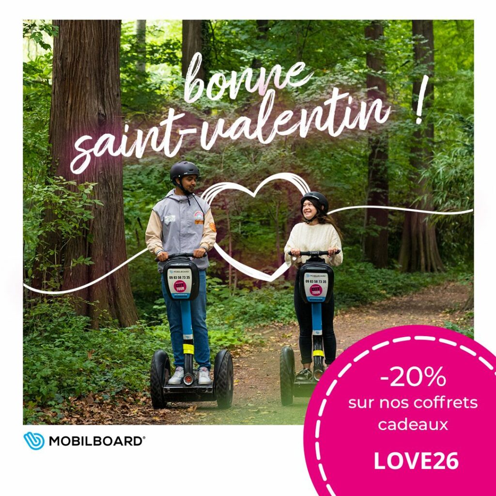 Jusqu’au 14 février, profitez de – 20% sur l’ensemble des coffrets cadeaux spéciales Saint Valentin !! Offrez à votre moitié une expérience unique lors d’une balade guidée en Segway ou optez pour une virée en amoureux en trottinette électrique le long des plages ou des menhirs de Carnac.