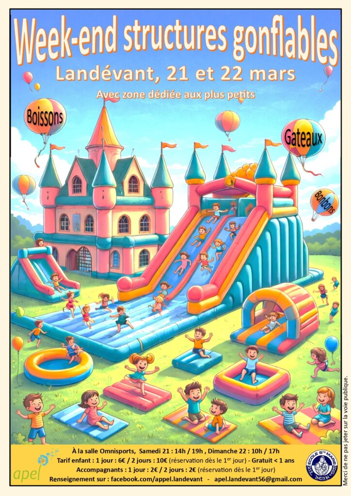 L’APEL de l’école Ste Marie de Landévant organise un week-end spécial structures gonflables les 21 et 22 mars 2026 à la salle omnisports de Landévant.