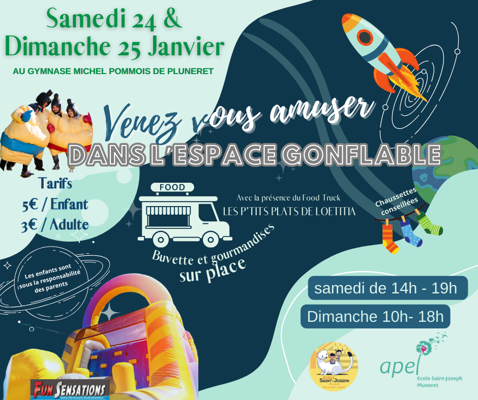 Rendez-vous au gymnase Michel Pommois à Pluneret les samedi 24 et dimanche 25 janvier, pour la 4ème édition du parc de jeux gonflables, organisé par l’APEL de l’école Saint Joseph de Pluneret !